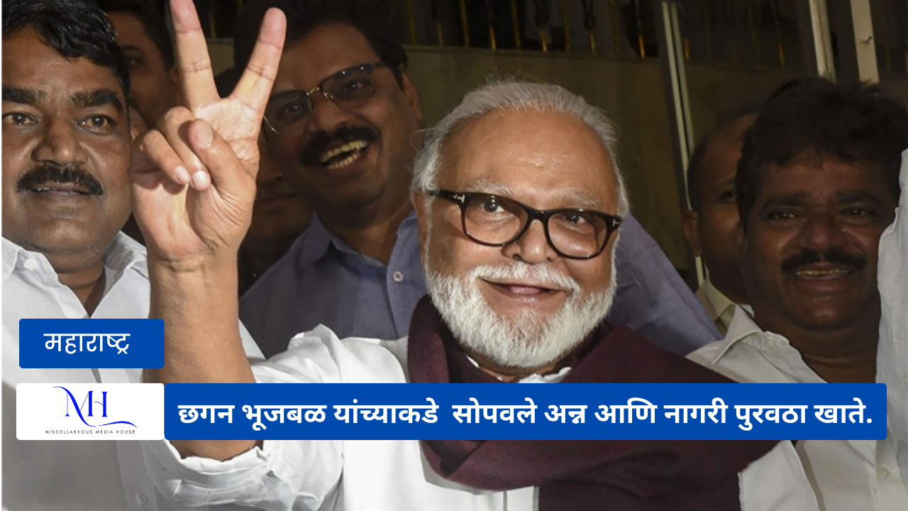 महाराष्ट्रातील देवेंद्र फडणवीस यांच्या नेतृत्वाखालील मंत्रिमंडळात सामील झाल्यानंतर चार दिवसांनी राष्ट्रवादी कॉंग्रेस पक्षाचे (एनसीपी) ज्येष्ठ नेते छगन भुजबळ ( Chhagan Bhujbal )यांना शुक्रवारी अन्न आणि नागरी पुरवठा खाते ( Food And Civil Supply department ) देण्यात आले आहे. याआधीही त्यांनी या विभागाचा कार्यभार संभाळलेला आहे. माझ्याकडे भारतीय जनता पार्टीच्या महायुती सरकारने अन्न आणि नागरी पुरवठा विभागाचे कामकाज सुपूर्त केले आहे.
